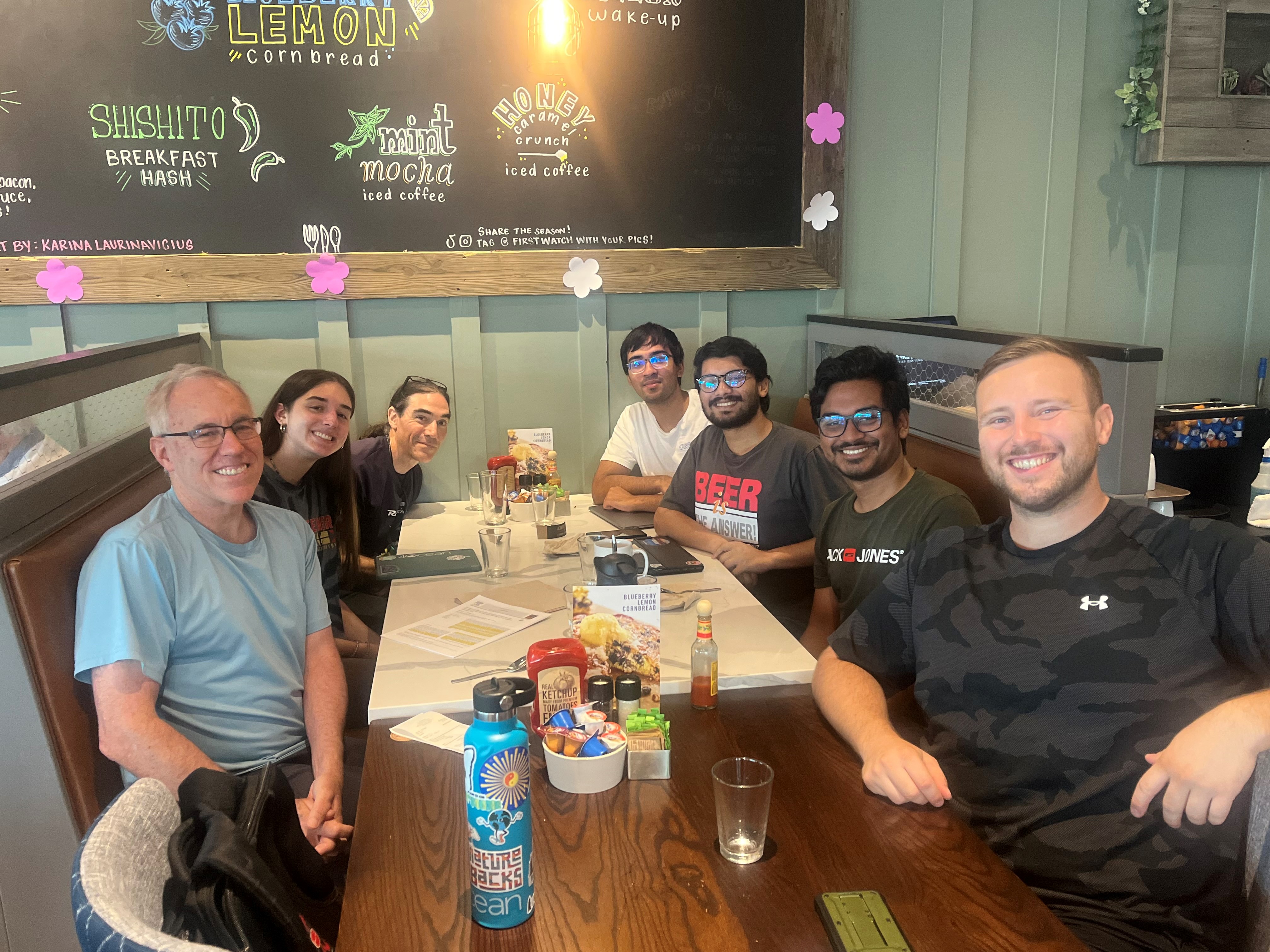 (Below) While not everyone, this is some of the group at a breakfast celebrating the the graduation of Shivam Chauhan, an undergraduate student in Chemical Engineering who completed a Senior Project with us.